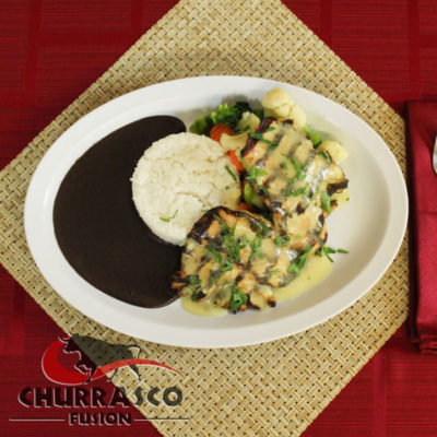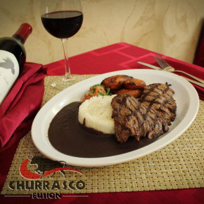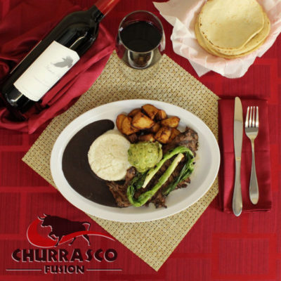 Servido con arroz blanco, frijoles, papas doradas, guacamole y tortillas hechas en Churrasco Fusión