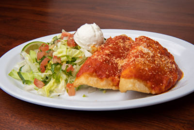 Two Chicken stuffed fried Empanadas served with lettuce, sour cream, parmesan cheese, tomato sauce and pico de gallo. / Dos empanadas servidas con con lechuga, crema agria, queso parmesano, salsa de tomate y pico de gallo.