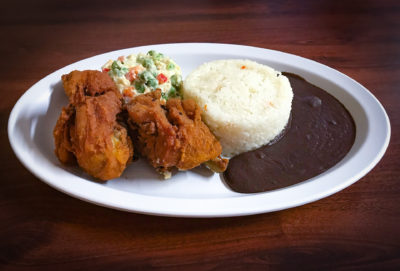 Golden chicken. Servido con frijoles negros, arroz y ensalada de papa Rusa. / Served with black beans, rice and Russian potato salad.