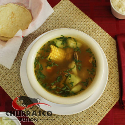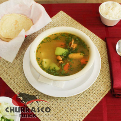 Sopa de gallina con vegetales, arroz y tortillas hechas en Churrasco Fusion