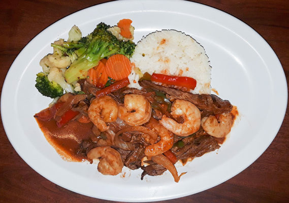 Beef and shrimp served with peppers, onion, tomato sauce, rice and vegetables