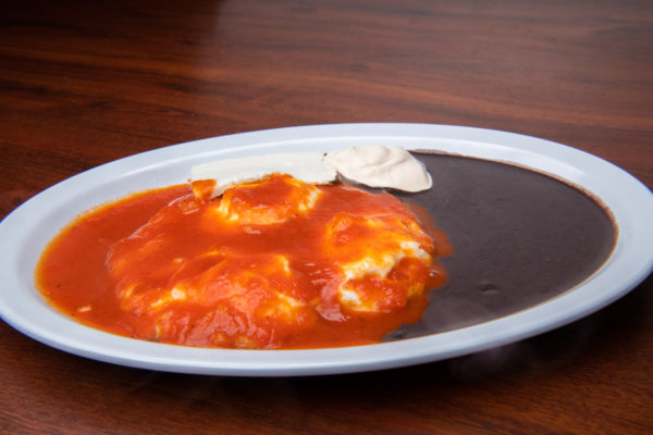 3 huevos estrellados con salsa de tomate, frijoles negros licuados,queso fresco, crema agria y tortillas hechas en Churrasco Fusion
