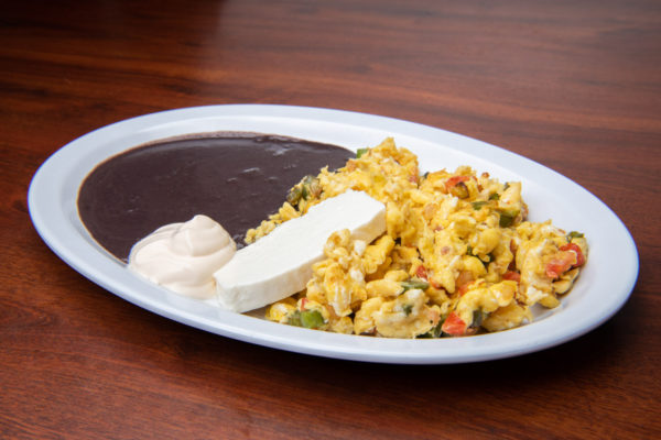 Huevos con tomate, cebolla, jalapeños, frijol negro licuado, queso fresco, crema agria y tortillas hechas en Churrasco Fusion.